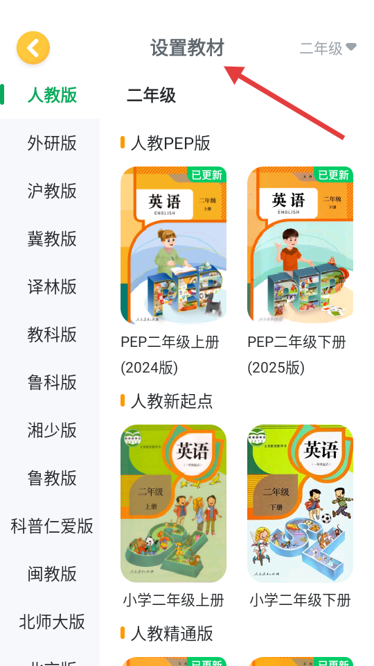 2、教材設置界面能選年級,展示人教版、外研版等多版本英語教材,如二年級人教PEP版含2024與2025版本。