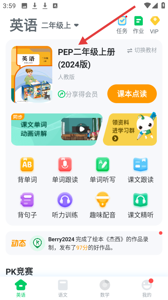 3、點擊二年級上冊2024版,有課本點讀按鈕,分享得會員,功能區涵蓋背單詞、課文跟讀等。