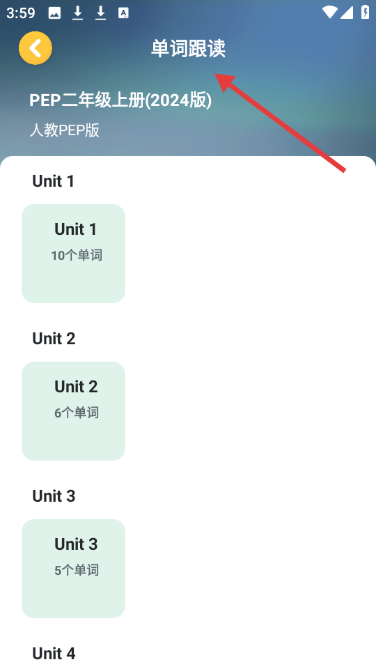 4、單詞跟讀頁面對應PEP二年級上冊2024版,清晰列出各單元及單詞數量,便于學生進行單詞跟讀練習。