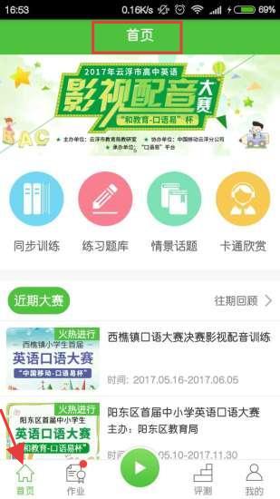 1、首頁以綠色為主色調,展示2017年云浮市高中英語影視配音大賽等活動,還有同步訓練、情景話題等學習板塊。