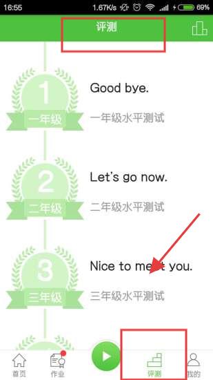 2、評測頁面提供一至三年級英語水平測試,如Good、bye等語句,幫助用戶了解自身英語水平。