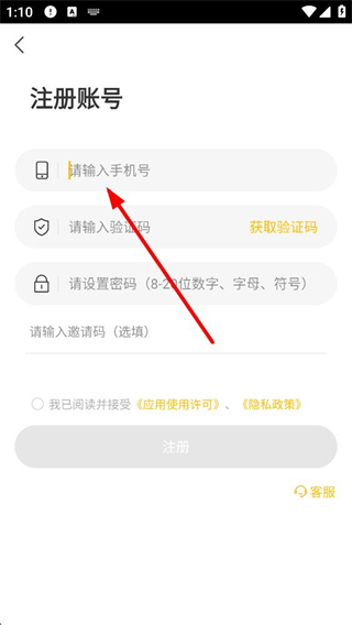 3、點擊注冊按鈕進入注冊賬號界面,依次輸入手機號獲取并填寫驗證碼,設置符合要求的密碼,選填邀請碼后勾選相關內容,就能準備完成注冊。