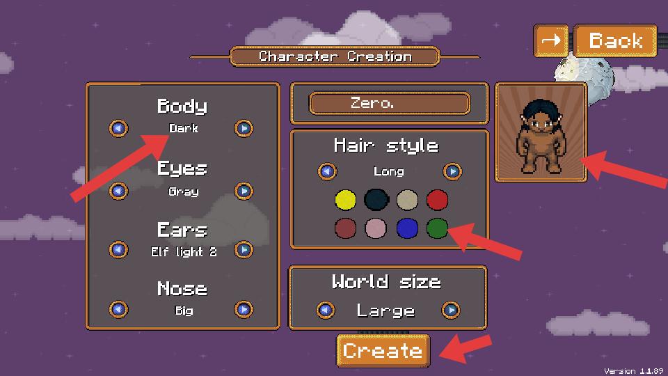 3、在角色創建界面,可調整角色的身體,眼睛,耳朵等外觀,以及選擇發型顏色,世界大小等,調整好后,點擊Create按鈕,完成角色創建。