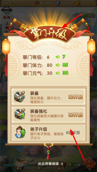 4、闖關獲得經驗可提升掌門等級,等級提升后開啟裝備強化等新功能,增強戰力,助力武俠世界的門派發展。