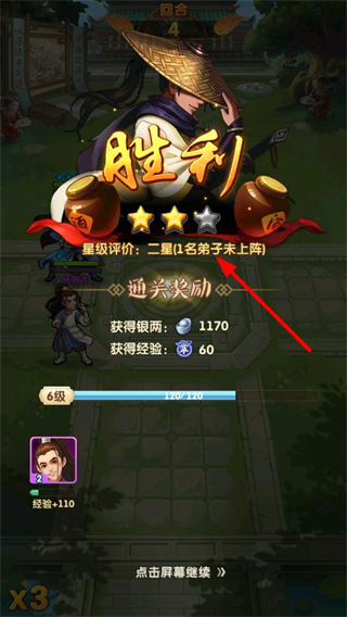 3、戰斗勝利后獲得星級評價,星級越高獎勵越豐厚,點擊屏幕繼續,解鎖后續關卡和玩法,積累資源。