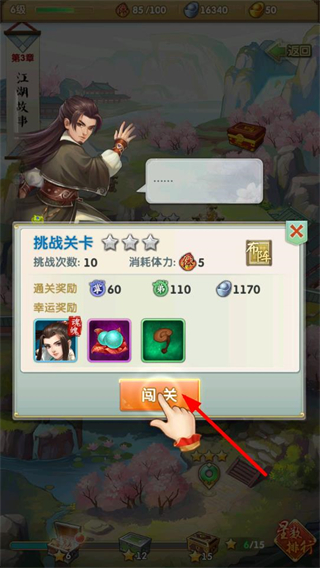 1、點擊闖關按鈕,挑戰江湖故事關卡,消耗5點體力,獲取銀兩、經驗等通關獎勵,開啟武俠冒險之旅。
