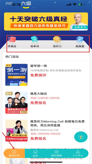 2、進入APP主界面,有學真經、背單詞、練聽力、刷真題等學習功能,還有熱門活動推薦,點擊底部個人中心可進入個人相關設置與信息頁面。
