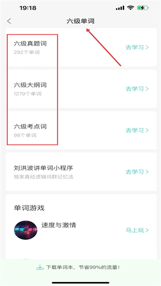 2、六級單詞板塊分類呈現多種單詞資源,清晰標注單詞數量,支持去學習功能,覆蓋不同維度詞匯積累。