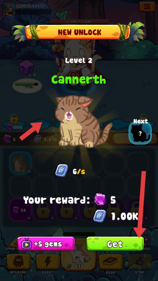 3、解鎖新貓咪時,會有提示界面,顯示新貓咪的相關信息,點擊Get按鈕,就能領取解鎖獎勵,獲得寶石等資源。