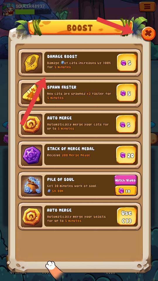 4、游戲有增益界面,里面有DAMAGE BOOST,SPAWN FASTER等不同增益效果,消耗寶石可激活,能在一定時間內提升貓咪的能力。