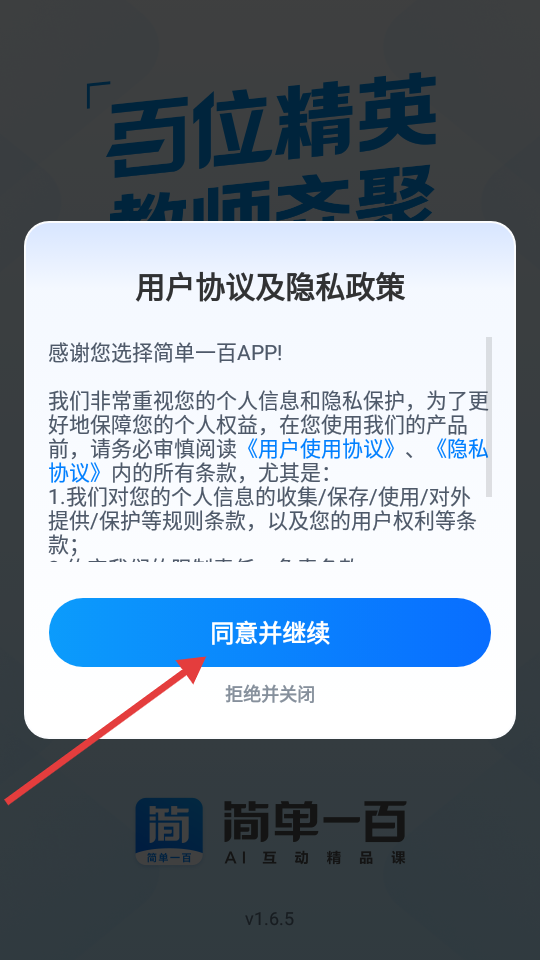 1、啟動簡單一百APP彈出用戶協議及隱私政策窗口,強調對個人信息的保護,點擊同意并繼續方可進入應用。