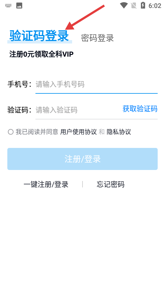 2、登錄頁面提供驗證碼登錄選項,注冊可0元領全科VIP,輸入手機號、驗證碼,勾選協議后即可注冊或登錄。