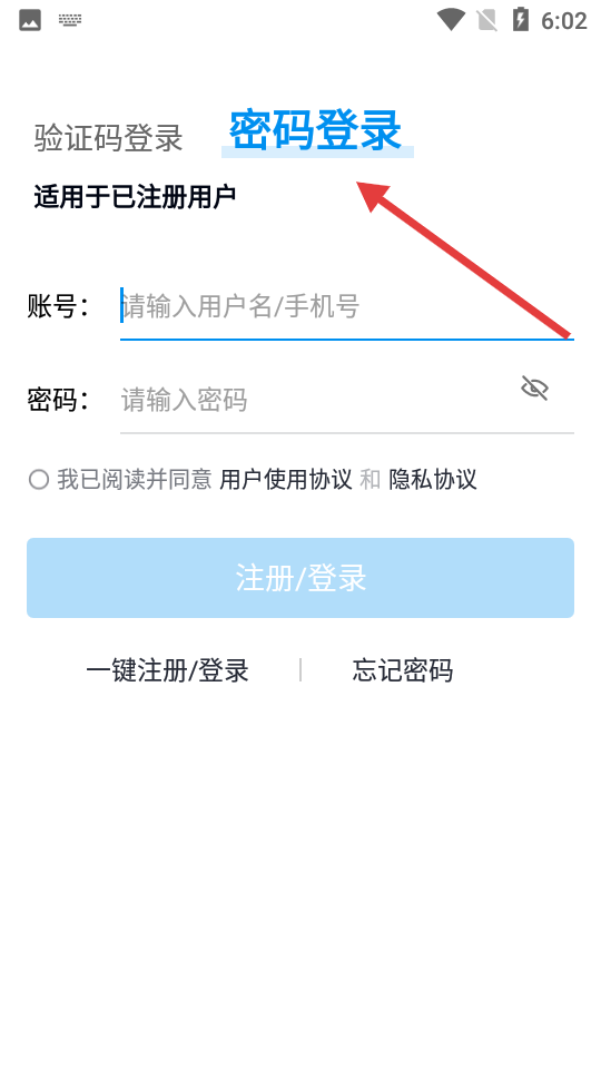 3、密碼登錄頁面專為已注冊用戶設計,輸入賬號和密碼,勾選協議后點擊注冊登錄方便快捷登錄應用。