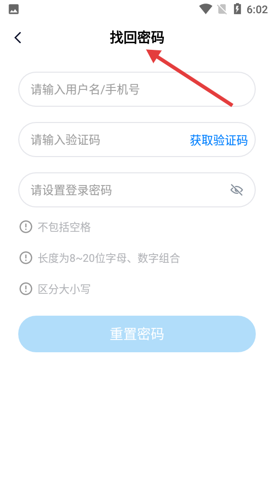 4、找回密碼頁面依提示輸入用戶名手機號、驗證碼,設置符合規則的新密碼即可完成密碼重置操作。