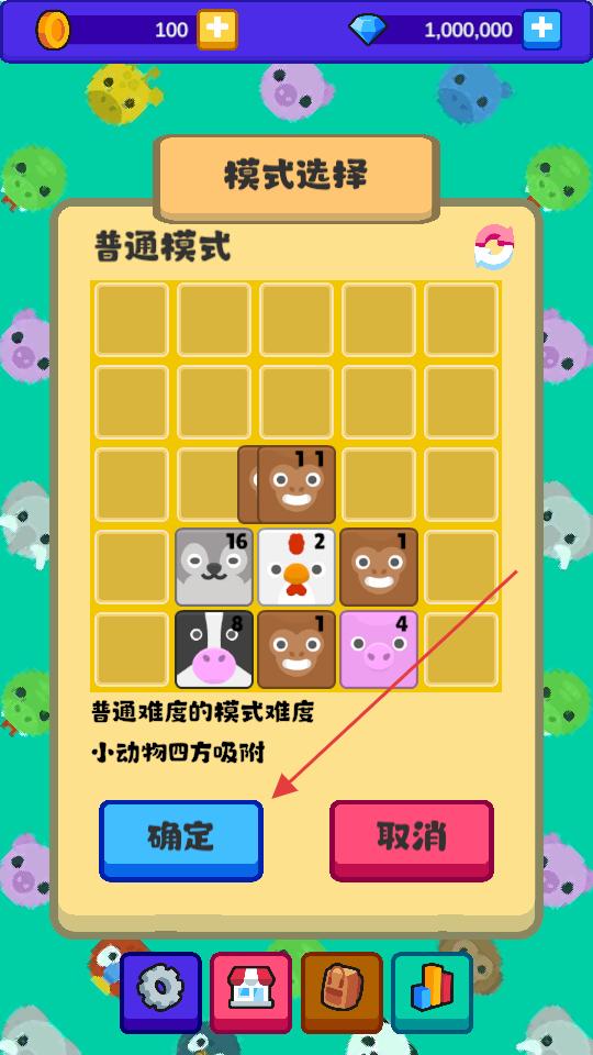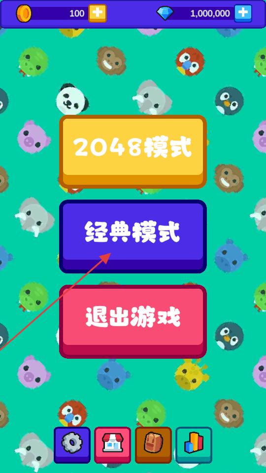 2、在模式選擇界面點擊確定按鈕,進入普通模式的游戲場景,此時看到帶有數字和動物圖案的方塊,準備進行方塊合并操作。