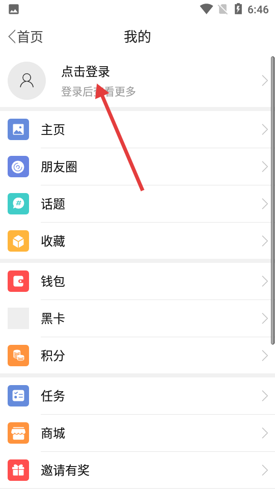 1、打開APP進入我的頁面,在這個頁面中你可以看到多個功能選項,如主頁、朋友圈、話題等,點擊上方登錄的選項,就能進入賬號密碼登錄頁面。