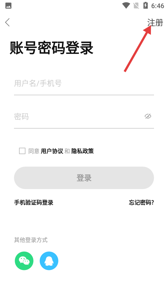 2、進入賬號密碼登錄頁面后,你會看到有用戶名手機號和密碼的輸入框以及登錄按鈕,在頁面的右上角有一個注冊選項,點擊它就可以進入注冊新賬號的頁面。