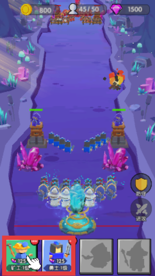 1、玩家下載游戲在游戲界面下方可以看到礦工單位,將他們派遣到有礦石資源的區域,礦工就會持續采集并轉化為金幣。