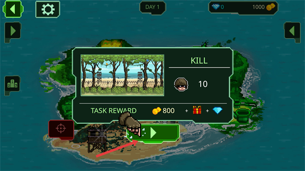 2、領取獎勵后,會出現任務界面,顯示需要擊殺的敵人數量,完成任務后,可獲得金幣、禮物和鉆石等獎勵,點擊綠色按鈕開始任務。