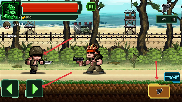 4、戰斗的過程,還會遇到持近戰武器的敵人,通過點擊左右移動按鈕,操控角色移動躲避敵人攻擊,同時找機會反擊敵人。