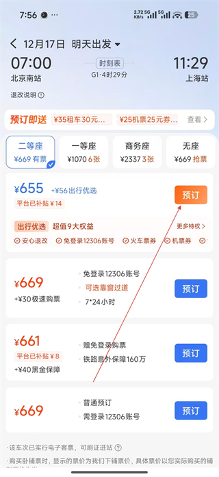 4、在車次詳情頁選擇想要購買的座位類型,點擊對應的預訂按鈕,可進入訂單填寫頁面,完成后續購票流程。