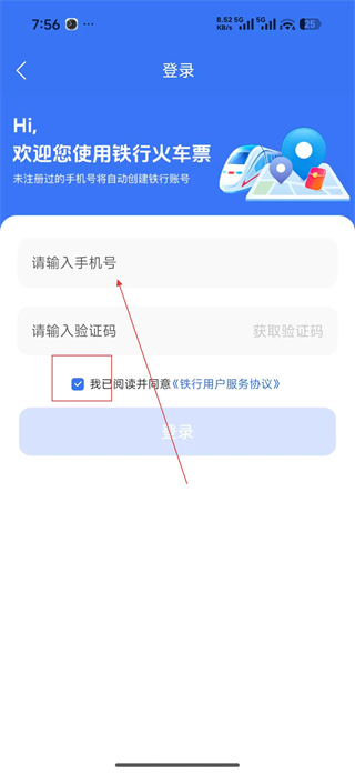 1、打開鐵行火車票APP,進入登錄頁面,在輸入框填寫手機號,勾選同意用戶服務協議,點擊獲取驗證碼,輸入后完成登錄。