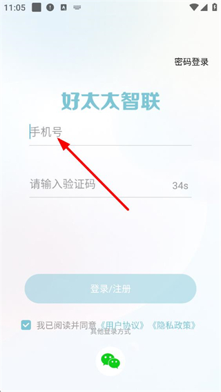 1、可選擇驗證碼登錄,輸入手機號、獲取并輸入驗證碼,勾選協議后登錄、注冊,也可選擇密碼登錄或微信等其他登錄方式。