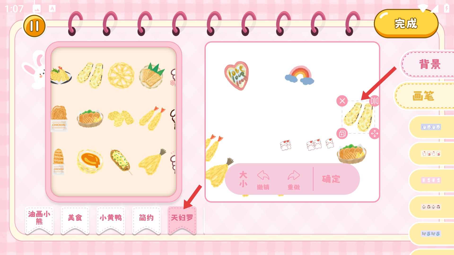 3、切換到天婦羅主題分類,能看到各類天婦羅相關貼紙,選取貼紙后,可在右側調整其位置、大小等,打造專屬的創作畫面。
