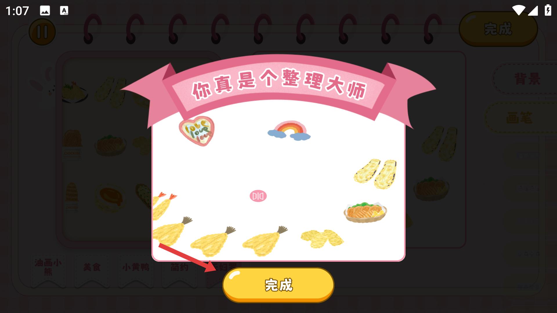 4、完成貼紙布置等創作后,界面會出現你真是個整理大師的提示,此時點擊完成按鈕,即可結束該關卡創作,收獲成就感。