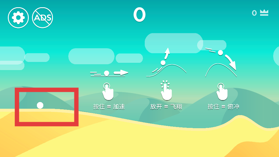 1、玩家按住屏幕時小球會加速放開屏幕小球則會飛翔,再次按住屏幕小球會進行俯沖快速下降,合理運用這些操作,能夠更好地應對不同的地形和障礙,獲取更高的游戲分數。