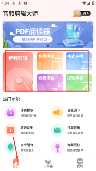1、首頁,提供音頻剪輯、拼接、格式轉換等核心功能,還有熱門功能如伴奏提取、音量調節,滿足音頻處理基本需求。