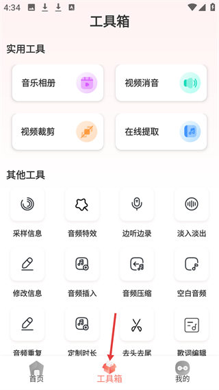 2、工具箱板塊有音樂相冊、視頻消音等實用工具,還有采樣信息、音頻特效等其他工具,助力音頻精細化編輯。