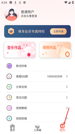 3、我的板塊可登錄,查看音樂和視頻作品,有歌詞列表等功能入口,支持分享應用、查看常見問題。