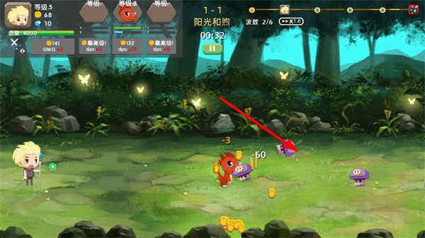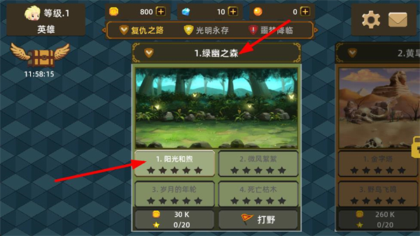 2、選擇關卡如綠幽之森的陽光和煦,進入戰斗場景,挑戰怪物,獲取經驗和資源,提升英雄等級。