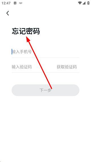 4、進入忘記密碼頁面,輸入手機號并獲取驗證碼,將驗證碼填入對應區域后,點擊下一步按鈕推進密碼重置流程。