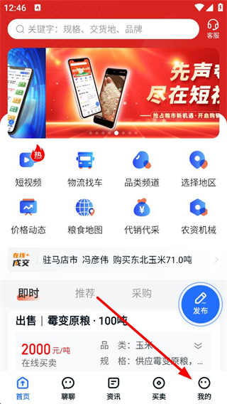 1、進入中時通農產品平臺首頁,可見短視頻物流找車等功能,還有即時交易信息展示,點擊底部我的選項,進入登錄相關頁面。