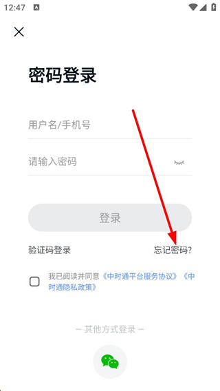 3、切換到密碼登錄界面,需填寫用戶名、手機號與密碼,還能點擊忘記密碼按鈕,進入密碼找回的操作頁面。