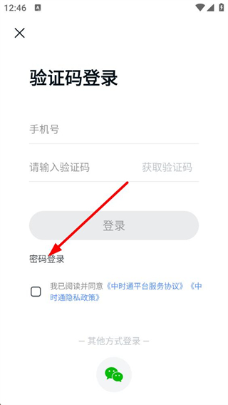 2、進入我的頁面后,顯示驗證碼登錄界面,可填寫手機號獲取驗證碼登錄,也能點擊密碼登錄選項切換登錄方式。
