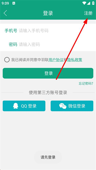 2、點擊我的進入登錄界面,需填寫手機號和密碼,勾選我已閱讀并同意中羽聯用戶協議和隱私政策,可點擊登錄,也支持用QQ或微信等第三方賬號登錄。