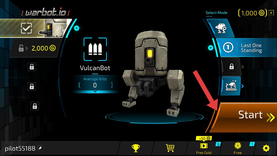 1、游戲開始,選擇VulcanBot機器人,點擊橙色Start按鈕,進入游戲,可選擇Last One Standing等模式開啟對戰。
