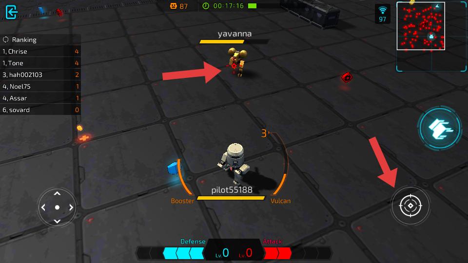 3、游戲中操控機器人在場景里移動,瞄準其他機器人,點擊射擊按鈕發起攻擊,同時可使用推進器快速移動,參與對戰。