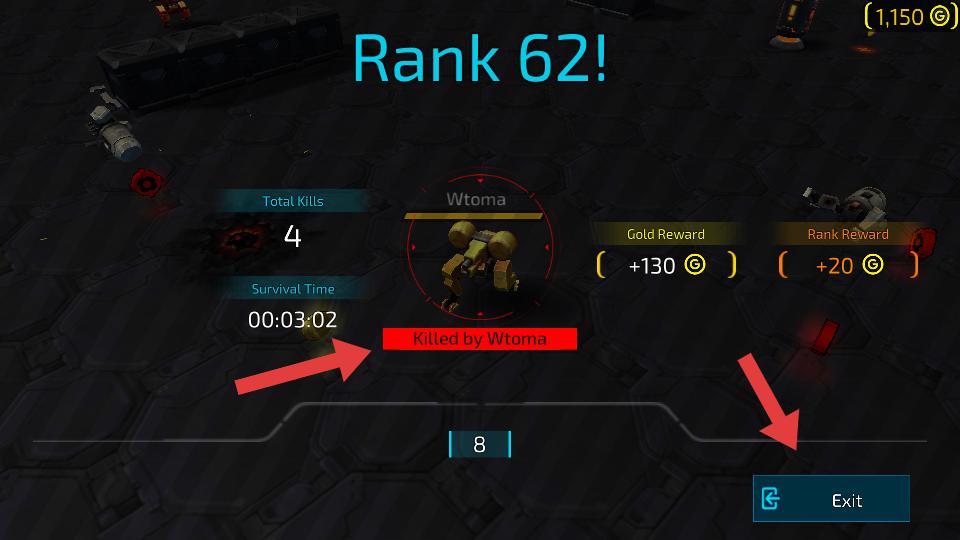 4、對戰結束后,界面顯示排名,總擊殺數,存活時間等,獲得金幣獎勵,點擊Exit退出對戰界面。