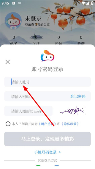 4、也可選擇賬號密碼登錄,輸入賬號、密碼和圖形驗證碼,勾選用戶協議和隱私政策后點擊登錄,若忘記密碼可點擊忘記密碼找回。