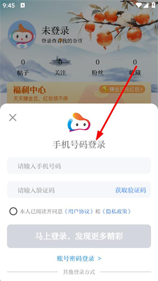 3、登錄選擇界面可選擇手機號碼登錄,輸入手機號碼、獲取并輸入驗證碼,勾選用戶協議和隱私政策后即可登錄。