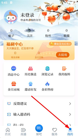 2、點擊底部我的按鈕,進入個人中心界面,可看到消息中心、歷史推送等功能,顯示未登錄狀態,點擊登錄可進入登錄選擇界面。