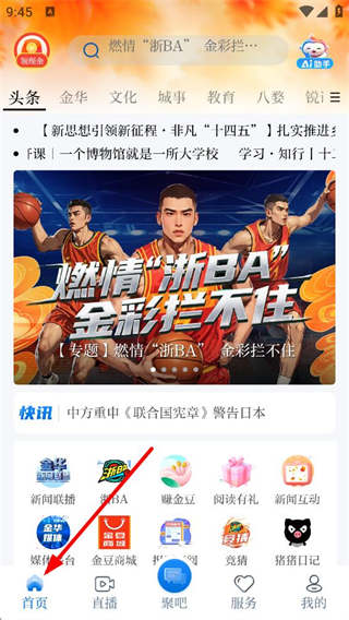 1、進入應用后首頁可瀏覽頭條、金華、文化等各類資訊,還有新聞聯播、浙BA等功能入口,能獲取本地新聞和各類服務信息。