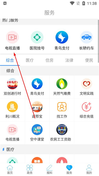 3、點擊服務板塊,含電視直播等熱門服務,按綜合、醫療等分類,有找工作、天然氣繳費等服務。