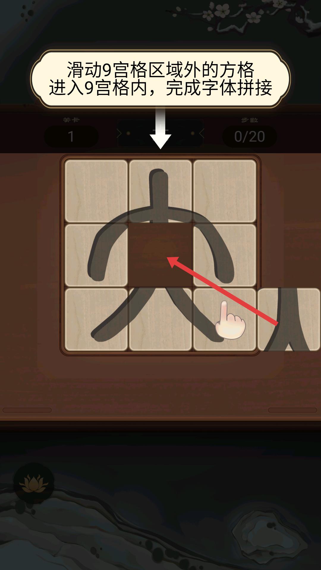 4、游戲里有九宮格區域,玩家可滑動九宮格區域外的方格,使其進入九宮格內,通過這樣的操作,完成字體的拼接,推進字體拼接的游戲進程。