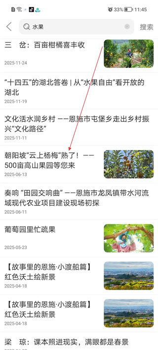 3、在搜索結果中選擇朝陽坡云上楊梅熟這篇資訊,點擊進入該資訊的詳情頁面,閱讀新聞資訊然后點擊下角的分享按鈕。