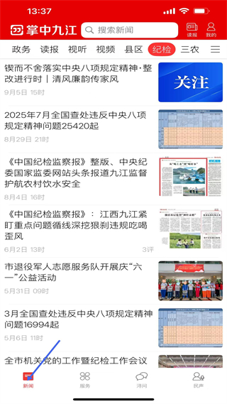 1、新聞頁有頭條、政務等頻道,海量資訊實時更新,像防汛責任人名單、天氣預警等內容,助你掌握九江動態。